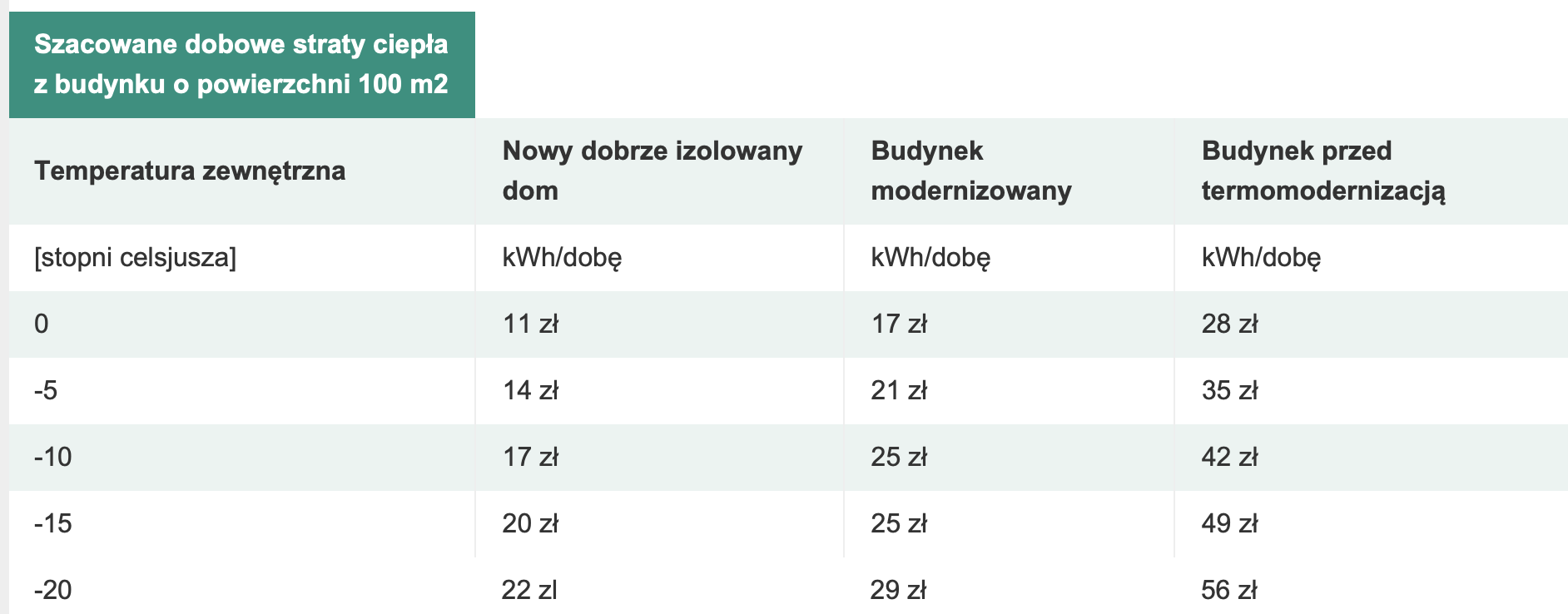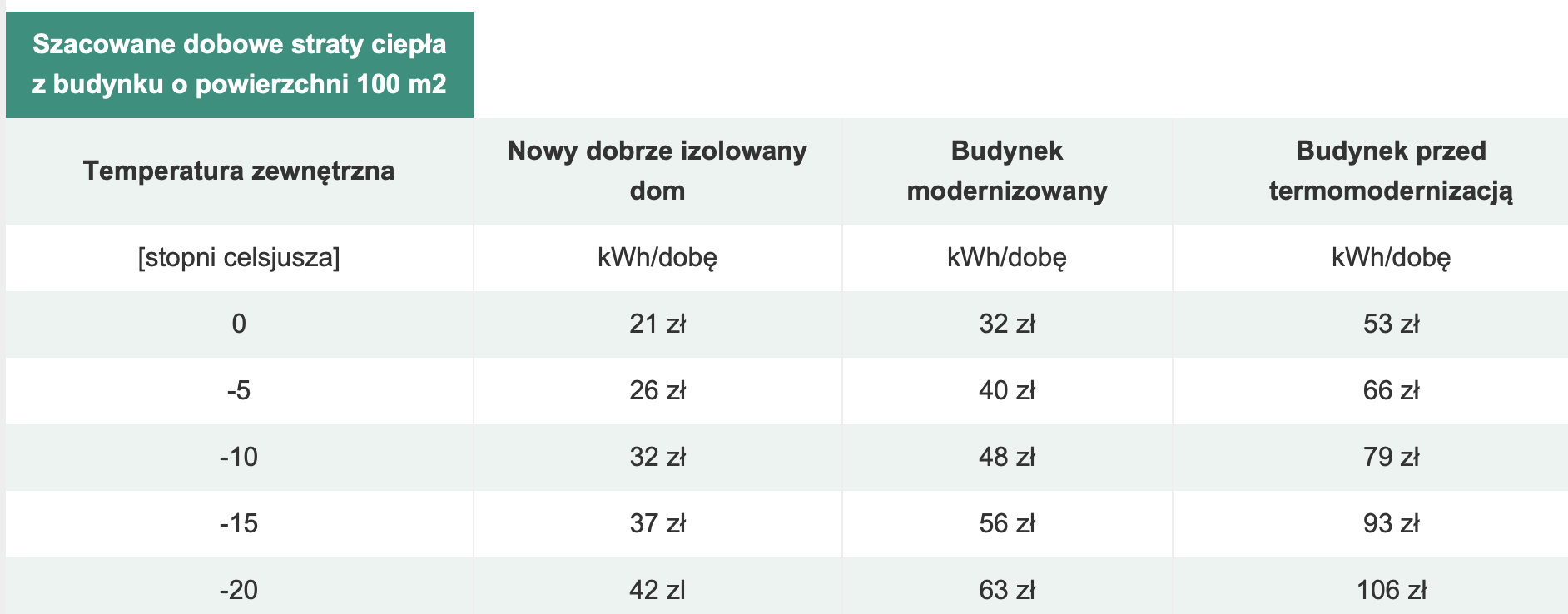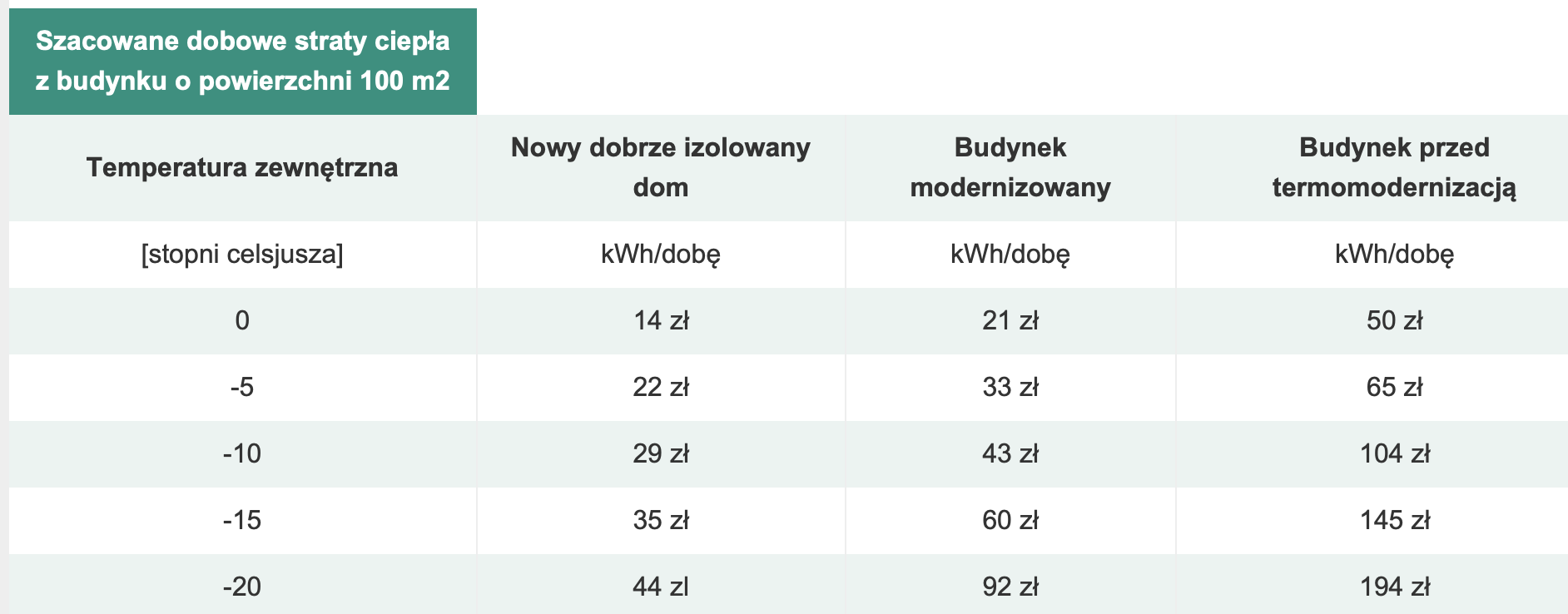 Aktualnie 1 kWh energii elektrycznej z uwzględnieniem opłat dystrybucyjnych kosztuje ok. 1 zł brutto. Przy temperaturze zewnętrznej –10°C ogrzewanie nowego domu to wydatek rzędu 72 zł na dobę, natomiast w budynku o słabej izolacji nawet 180 zł dziennie lub więcej.