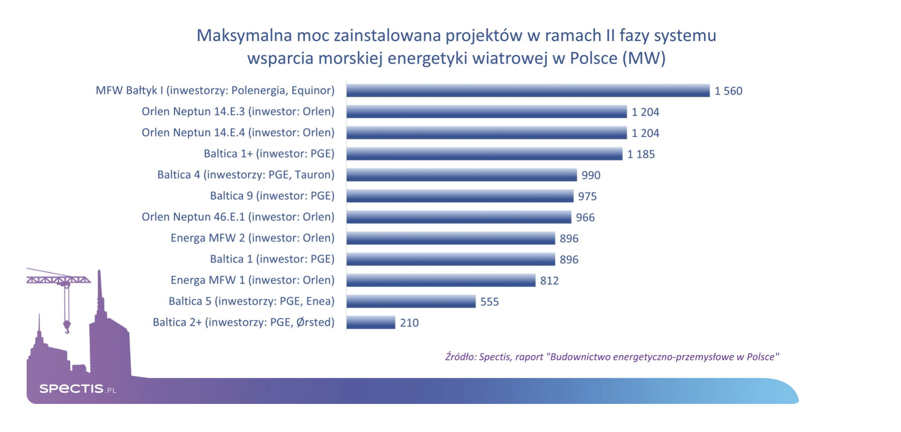 Według stanu na III kw. 2025 r. realizowanych jest dziewiętnaście projektów morskich farm wiatrowych, które posiadają już wydane pozwolenia lokalizacyjne. Siedem z nich obejmuje pierwszą fazę systemu wsparcia, w tym m.in. Baltica 3 (1045,5 MW), Baltica 2 (1498 MW), Baltic Power (1200 MW), BC-Wind (390 MW), FEW Baltic II (350 MW) oraz MFW Bałtyk II i MFW Bałtyk III (po 720 MW). Kolejne dwanaście projektów znajduje się w drugiej fazie systemu wsparcia.