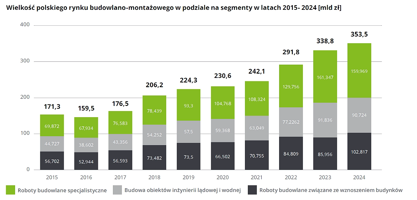 W 2024 roku wartość polskiego rynku budowlanego wzrosła o 4,3% w cenach bieżących, osiągając poziom 353,5 mld zł. Motorem wzrostu były przede wszystkim inwestycje w obiekty kubaturowe.